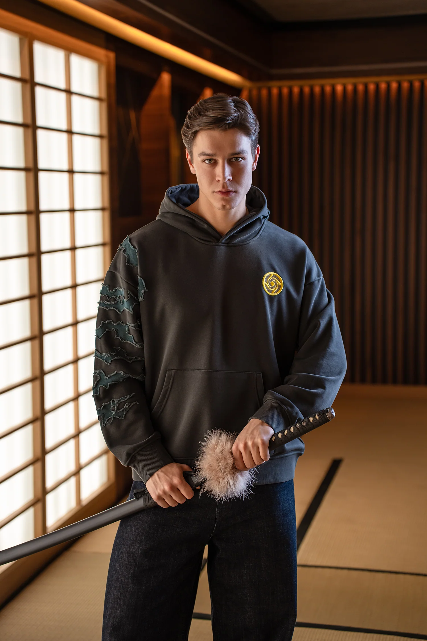 On the back, we embroidered her sword with extremely detailed stitching, making it the centerpiece of the hoodie. The embroidery brings depth and sharpness to the design, giving the piece a strong visual statement while honoring the character’s weapon.