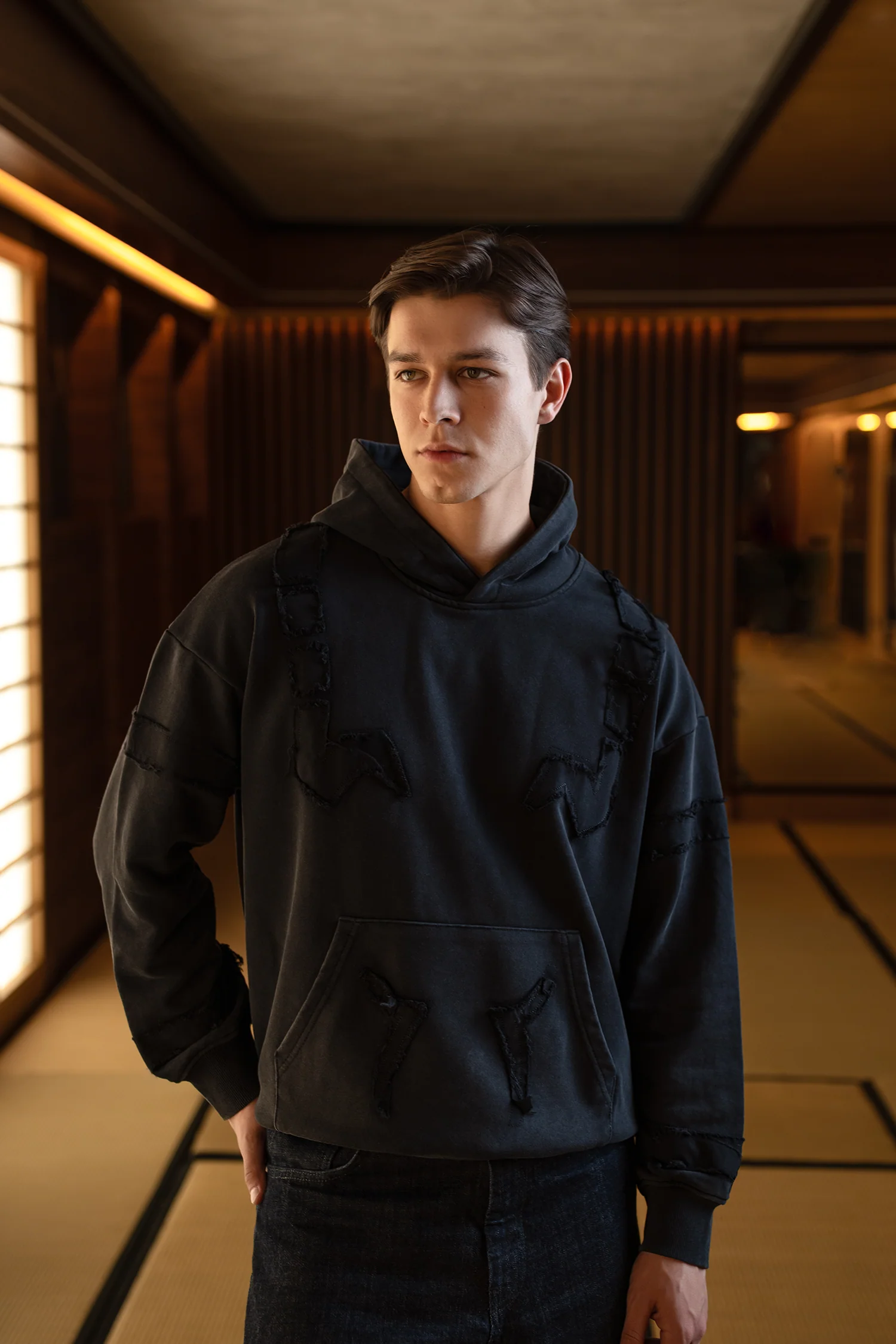 We built this piece around the character's infamous curse markings. The entire hoodie features hand-placed patchwork designed to resemble the pattern of his signature marks, finished in a black-on-black palette to keep the look minimal while still clear for those who recognize the reference.