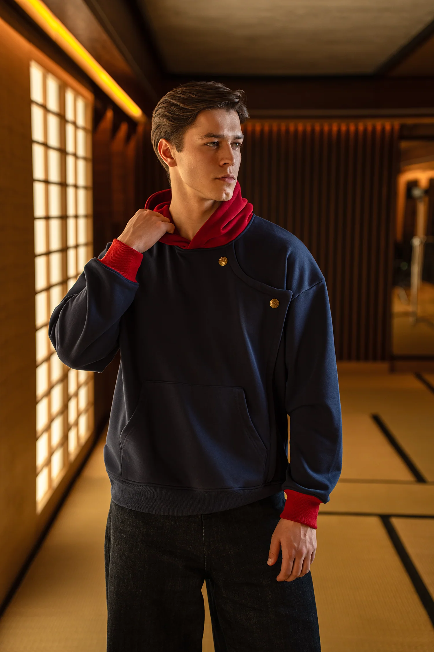 One of the standout features is the custom buttons, carefully designed to replicate the buttons from his uniform as closely as possible. These details bring authenticity to the piece and elevate the construction beyond a standard hoodie.